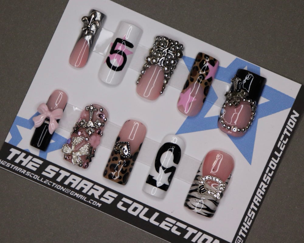 Various abstract designed french tips and star themed nails with silver stones and charms. Set comes with 20 nails(10 different sizes), nail glue, a nail file and instructions.