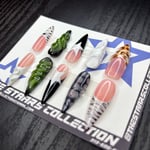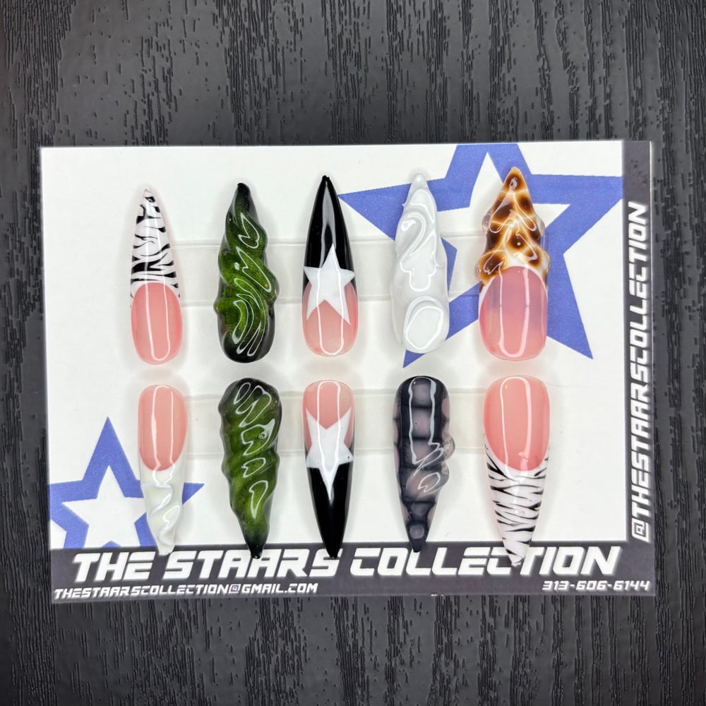 Varied colored and patterned nails with 3d art Set comes with 20 nails(10 different sizes), nail glue, a nail file and instructions.
