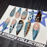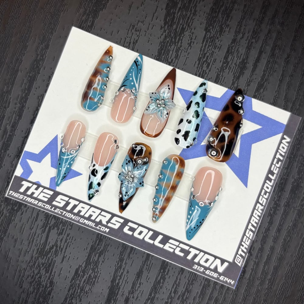 Blue and Brown cow print nails with flower 3d art and pearl charms. Set comes with 20 nails(10 different sizes), nail glue, a nail file and instructions.