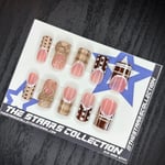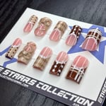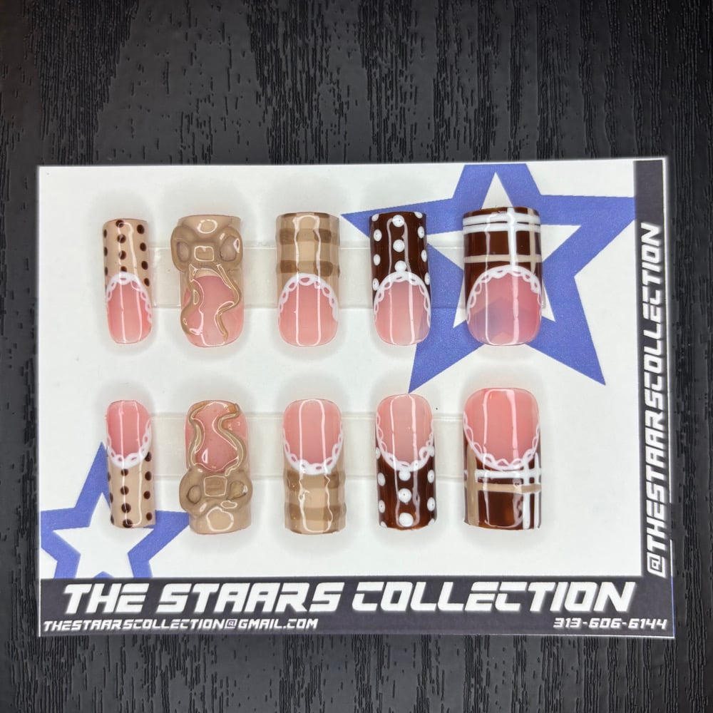brown cottage core themed french tips with 3d nail art. Set comes with 20 nails(10 different sizes), nail glue, a nail file and instructions.