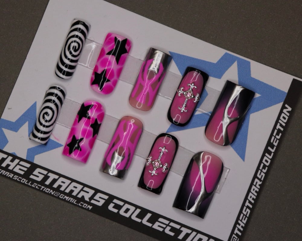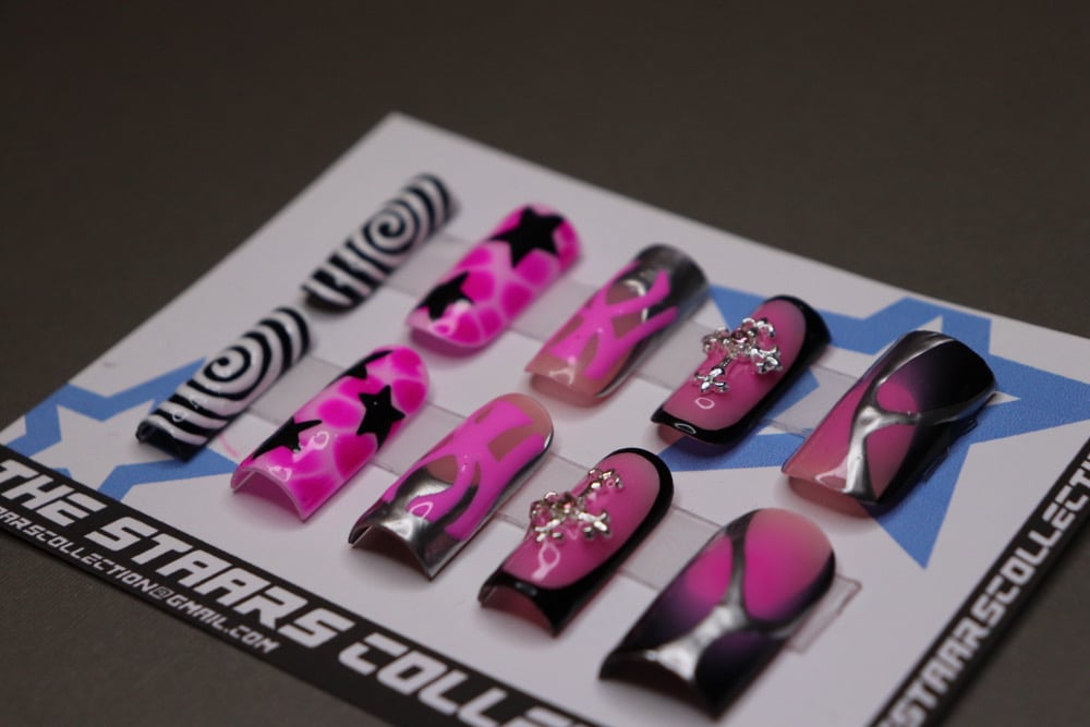 Pink and black aura, Ny yankees themed set. Set comes with 20 nails(10 different sizes), nail glue, a nail file and instructions.