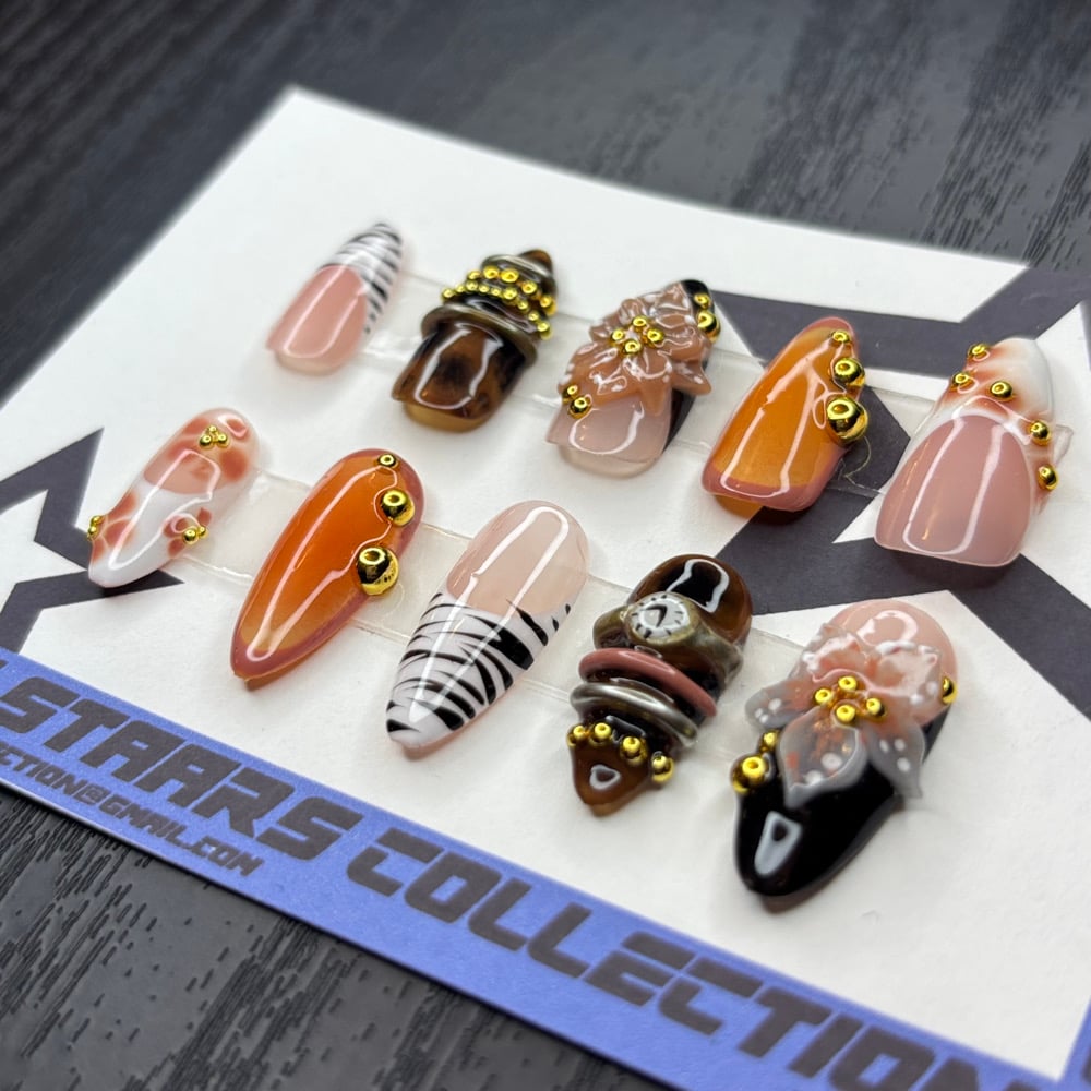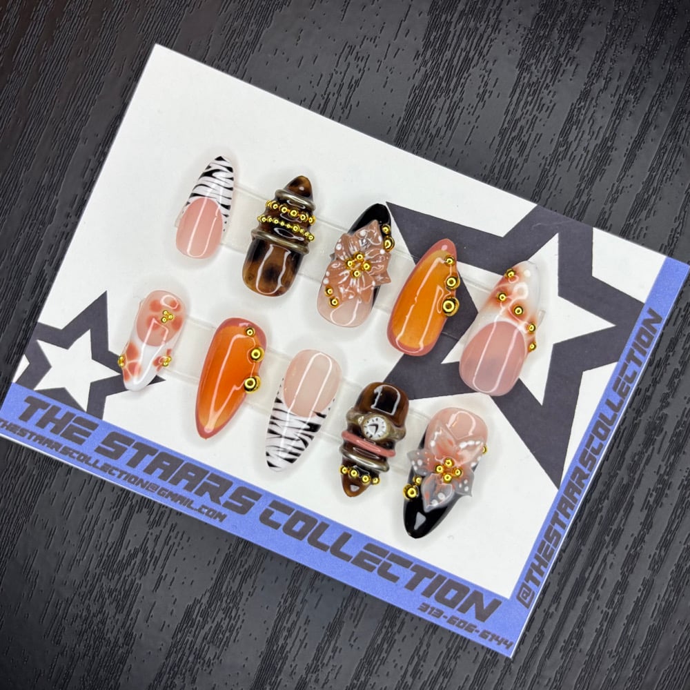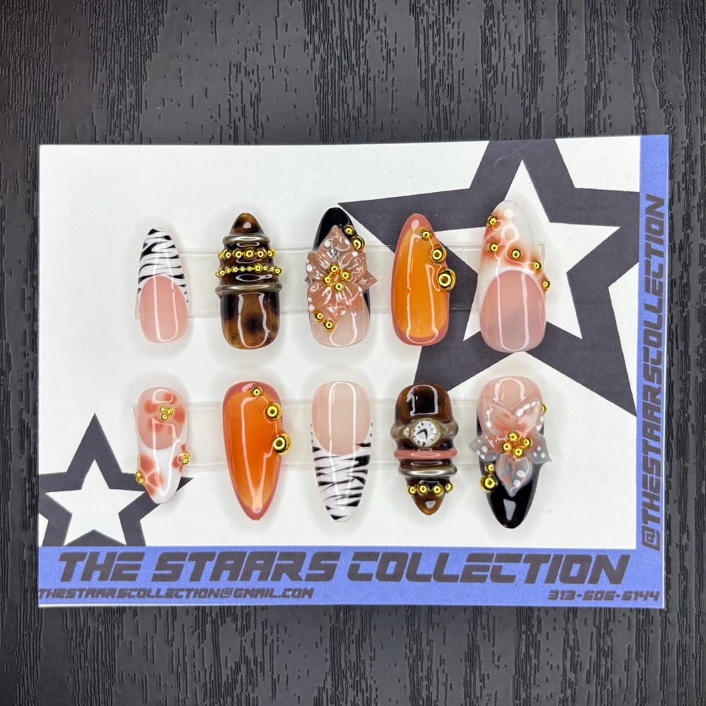 orange black and white almond nails with patterned accents and gold perls and flowers. Set comes with 20 nails(10 different sizes), nail glue, a nail file and instructions. ALL ALMOND SETS ARE MEDIUM